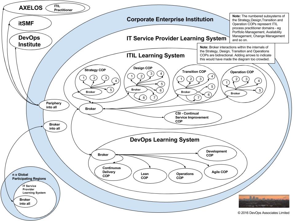 So what I mean by this is that the external institutions (AXELOS, itSMF, DevOps Institute) do not have a direct practitioner stake in the activities of the specific corporate enterprise institution in my model that has incubated the social learning systems but they may be very interested in the meta learning that is emerging from that interconnected CoP network within that enterprise because that knowledge is advancing the discipline of ITSM of which they are major stakeholders.